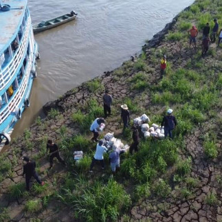 A viagem seguiu. Ao longo do percurso era possível ver um cenário bem diferente. Ilhas, bancos de areia e barrancos davam lugar onde era rio, antes da águas secarem. O que piorou ainda mais a situação de quem já morava em áreas de difícil acesso. Como a comunidade de Pacatuba, que fica no Careiro da Várzea, região metropolitana de Manaus, uma das beneficiadas pelo projeto. Na comunidade vivem aproximadamente 70 famílias. De lá até onde barco conseguiu ancorar, os moradores precisaram caminhar aproximadamente umas 4 horas, para pegar uma cesta básica e água. Foi o caso do Leonardo Castro, 12 anos, ele é o mais velho da casa, ajuda a cuidar dos irmãos com a mãe, ele caminhou horas e horas para receber a ajuda. “A gente já não sabe o que é comer feijão e arroz há muito tempo. A gente tá muito feliz com essa ajuda”, salientou o adolescente com sorriso no rosto.